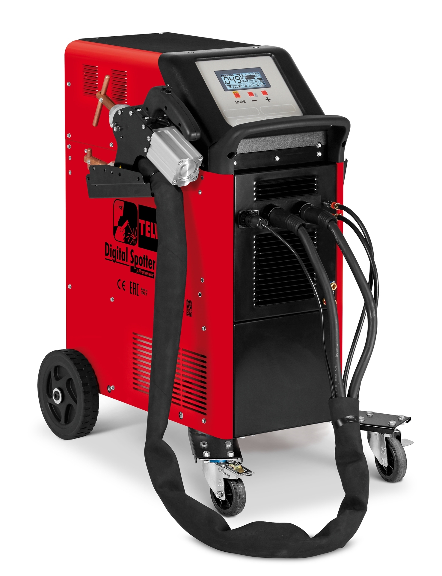 Elektronická mikroprocesorová multifunkční bodovací svářečka Digital Spotter 9000 Telwins pulsním a stejnosměrným režimem, včetně HSS ready. Jednostranné a oboustranné bodování, žíhání plechů, bodování šroubů, nýtů, hřebíků, podložek, kontaktů apod. s vodním chlazením kleští. S použitím sady obj. č. 802 833 možnost použití jako karosářské spotovačky jako Digital Car Spotter 5500
