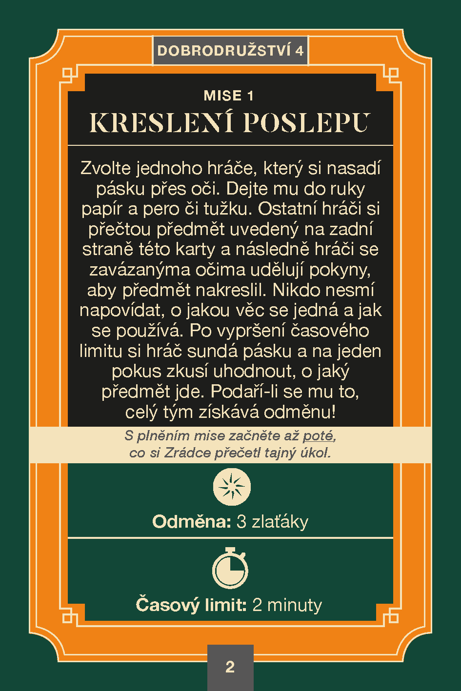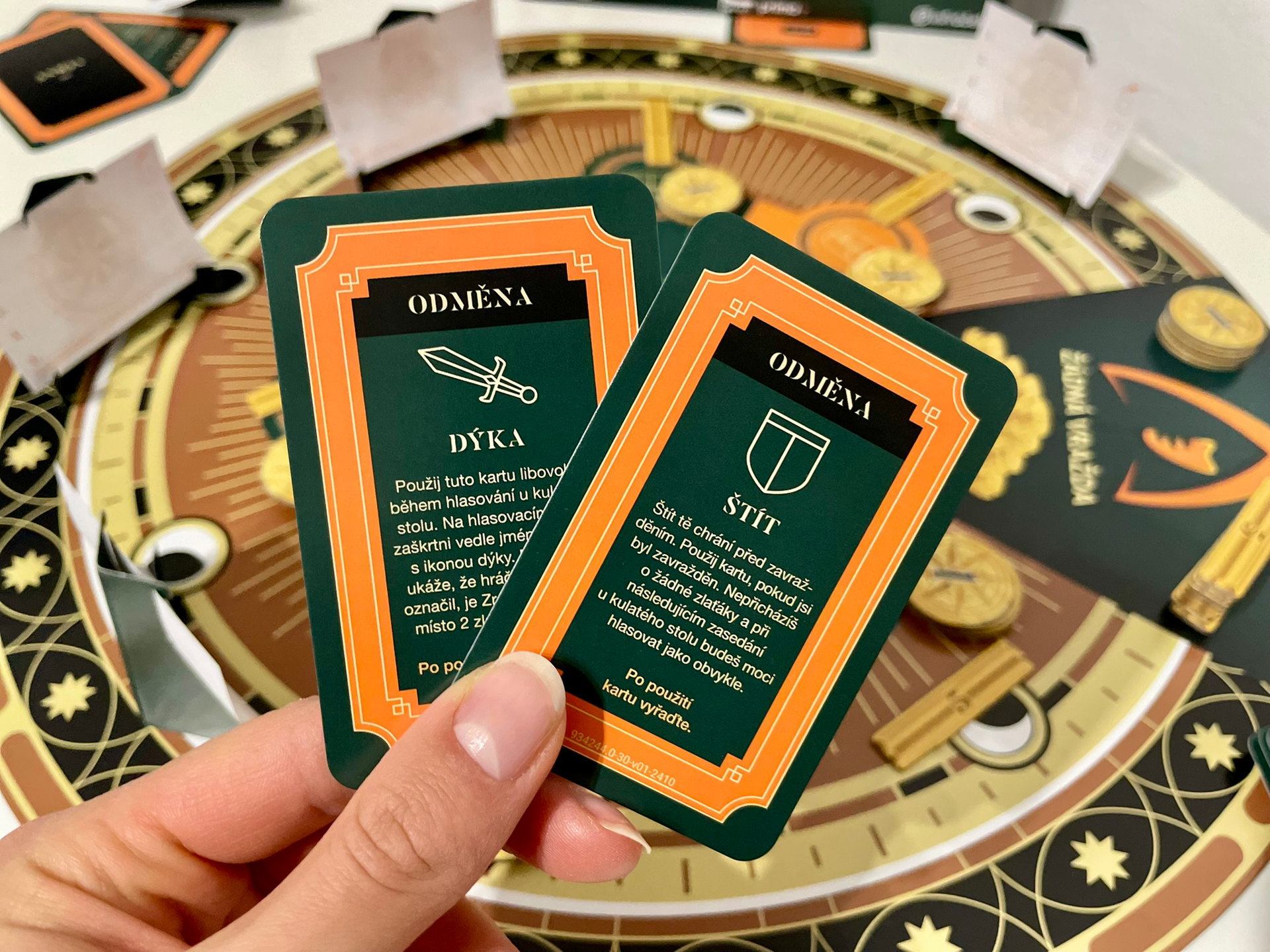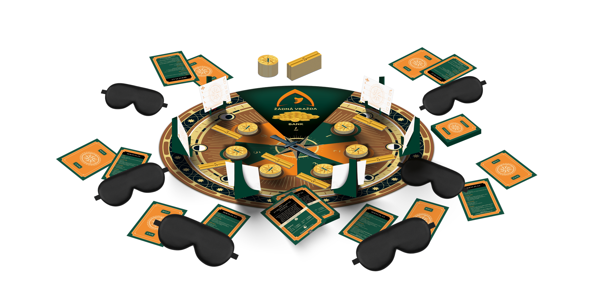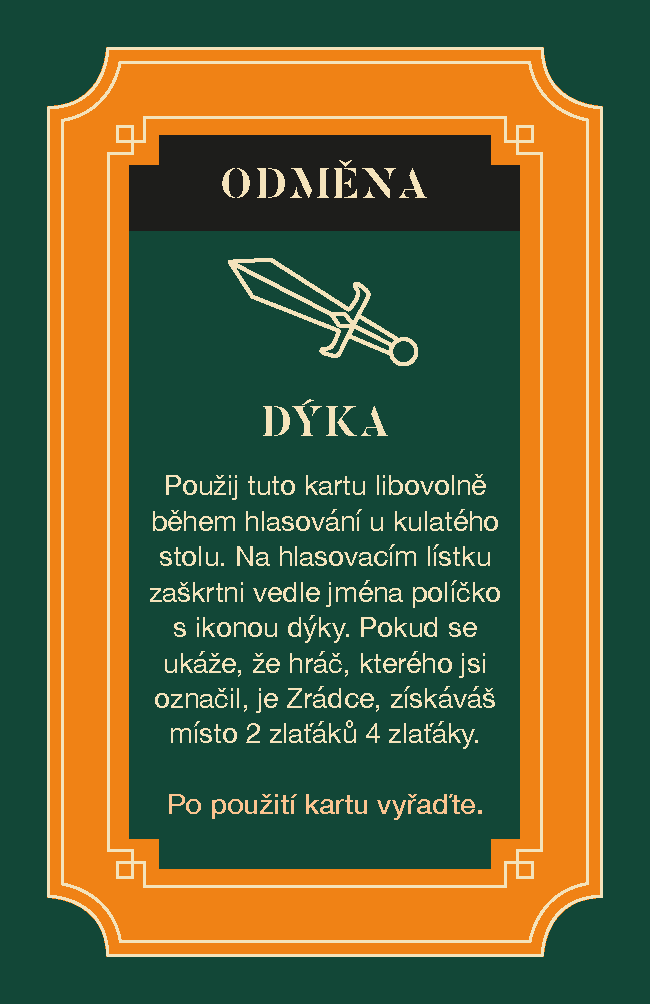 Obsah balení: Kulatá hrací deska s otočnou dýkou, 32 karet s misemi, 32 karet se zbrojnicí, 11 karet s rolemi, 12 karet s odměnami, 30 zlaťáků, 15 zlatých cihel, 48 hlasovacích lístků, 6 hlasovacích stojánků, 6x páska přes oči, kompletní a stručná pravidla hry.