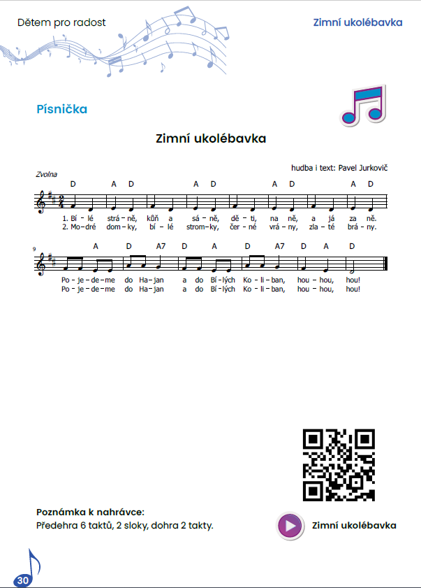 Jednotlivé písničky obsahují notové záznamy a QR kódy s klavírními nahrávkami.