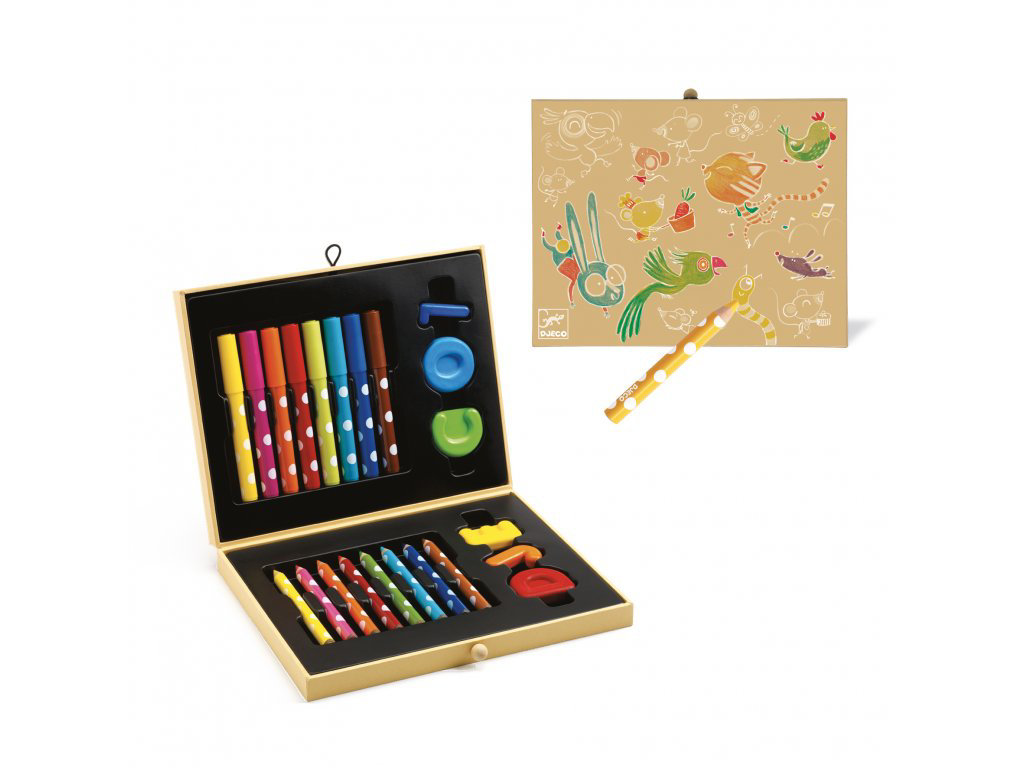 Výtvarnický kufřík pro malé začínající umělce.Nádherný kufřík pro děti od 18 měsíců obsahuje 8 fixů, 8 pastelek a 6 voskovkových kamenů, které se dětem dobře drží.Barvy jsou vypratelné.