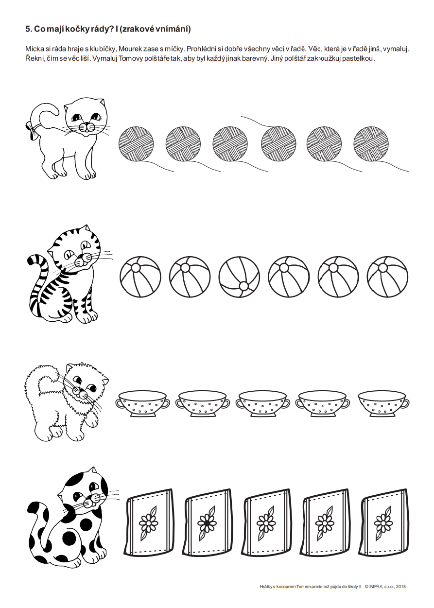 60 pracovních kopírovatelných listů se zaměřuje především na sluchové a zrakové vnímání, podporu předpočetních představ, zrakové paměti a pozornosti. Tyto nové pracovní listy představují již náročnější varianty a obměny téhož zadání úkolu. Děti na pracovních listech opět doprovázejí oblíbení kočičí kamarádi v čele s kocourem Tomem. Obrázky kocouří party nejen děti motivují k vlastní činnosti s pracovním listem, ale nabízejí možnost si obrázky vymalovat a vytvořit si krásné, barevné ilustrace.