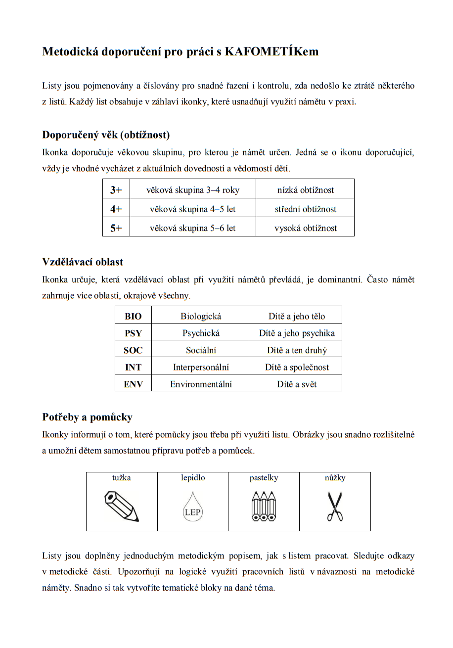 Z jednotlivých listů si snadno sestavíte vlastní tematický celek nebo projekt, který bude odpovídat zájmům a potřebám Vašich dětí. K jednoduché manipulaci se souborem přispívá i volné řazení listů, což umožňuje jejich snadné kopírování. Jednotlivé náměty jsou využitelné po celý školní rok. Práci s listy Vám usnadní jednoduché grafické ikonky.Poskytují informaci o věkové skupině, pro kterou je námět určen, současně také upozorňují na vzdělávací oblast, které se námět nejvíce dotýká, ikonky znázorňující druhy pomůcek, které si můžete připravit předem.