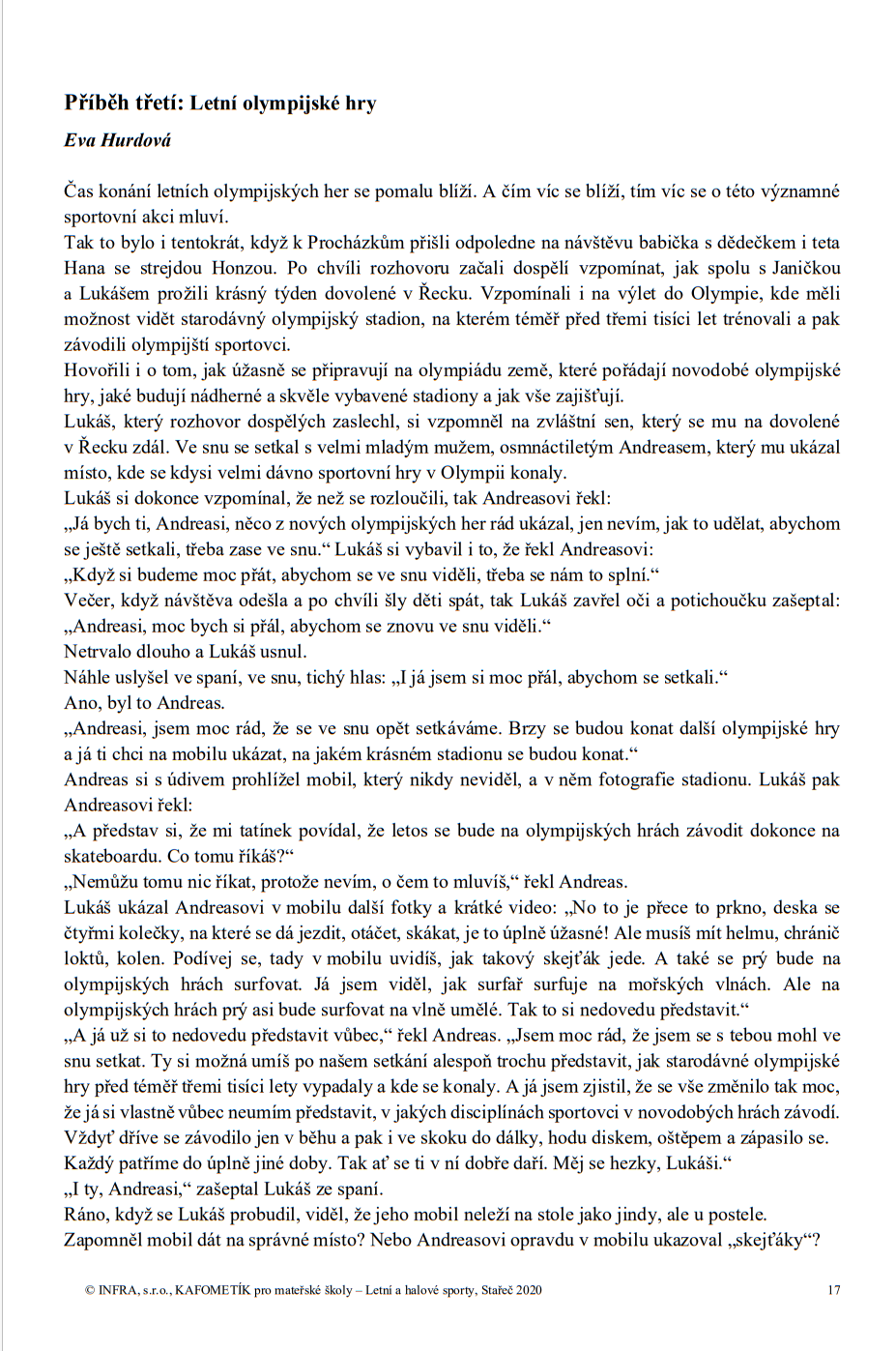 KAFOMETÍK LETNÍ A HALOVÉ SPORTY je desátým dílem ze známé řady tematických publikací s pracovními listy a metodikou. Tento díl KAFOMETÍKU jsme věnovali sportování. Jeho prostřednictvím chceme vám i dětem přiblížit co nejvíce sportů, i těch méně známých. A protože sportů je hodně, v tomto díle se budeme věnovat letním a halovým sportům. Jedním z nejvýznamnějších sportovních událostí jsou olympijské hry, konané jednou za 4 roky. Proto jsme téma olympijských her zařadili do příběhů a v metodice se věnujeme letním a i olympijským sportům.