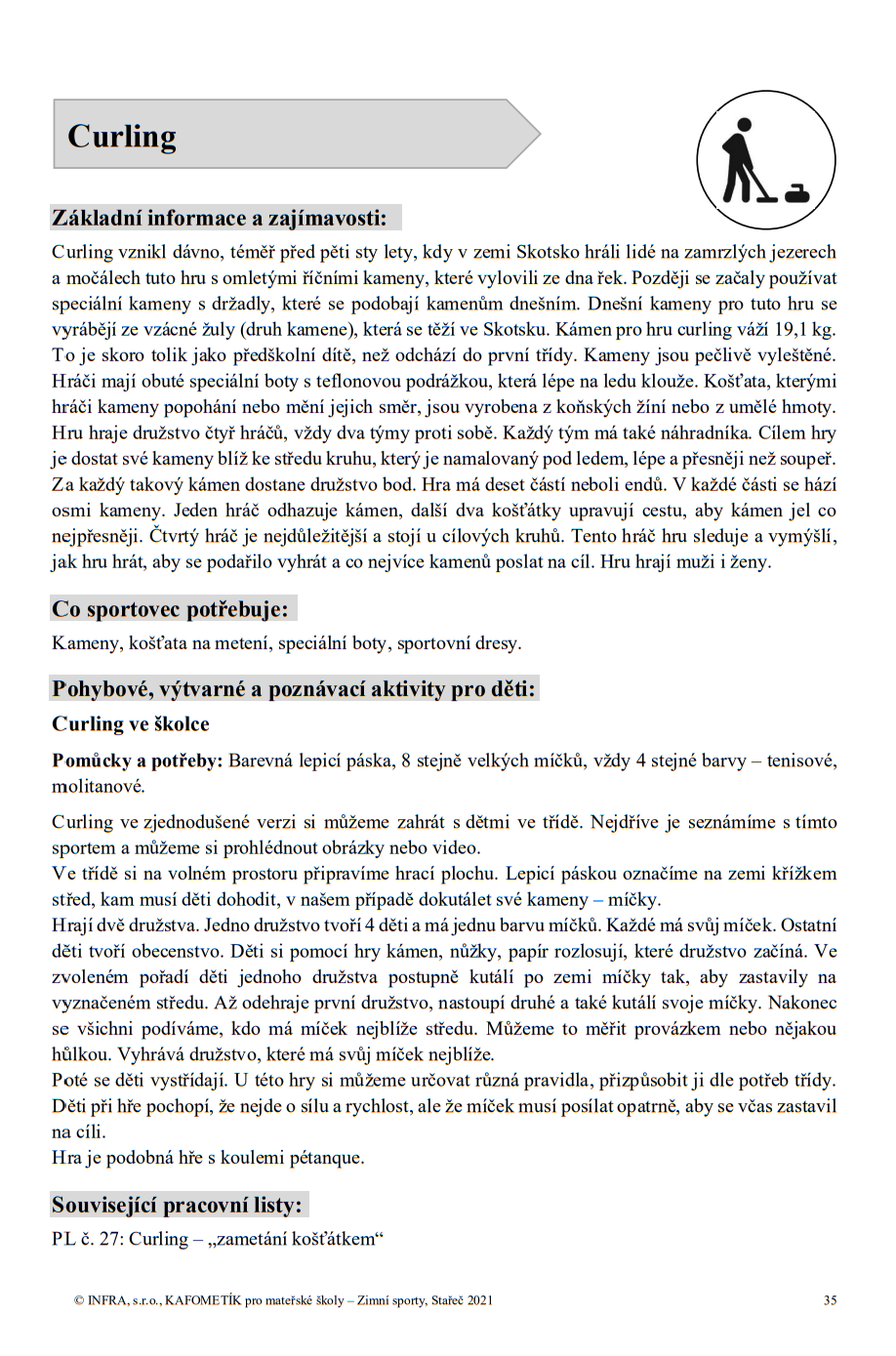 U zimních sportů se často setkáváte s tím, že jejich provozování je podmíněno počasím a sněhovou nadílkou. Zároveň ne všechny i při dobrých podmínkách lze venku s dětmi realizovat. S dětmi v mateřských školách nelze zkoušet a realizovat všechny zimní sporty a aktivity, některé sporty jsou pro předškolní děti náročné nebo nevhodné. Přesto jsme tyto sporty aspoň zmínili krátkou charakteristikou a k některým připravili pracovní listy. Děti se tak můžou s těmito sporty seznámit formou povídání, řešení úkolů na pracovních listech. Mnoho jich znají z televize a internetu. Proto jsou aktivity zaměřeny spíše na poznání konkrétního sportu a imitování v prostředí třídy a školy.