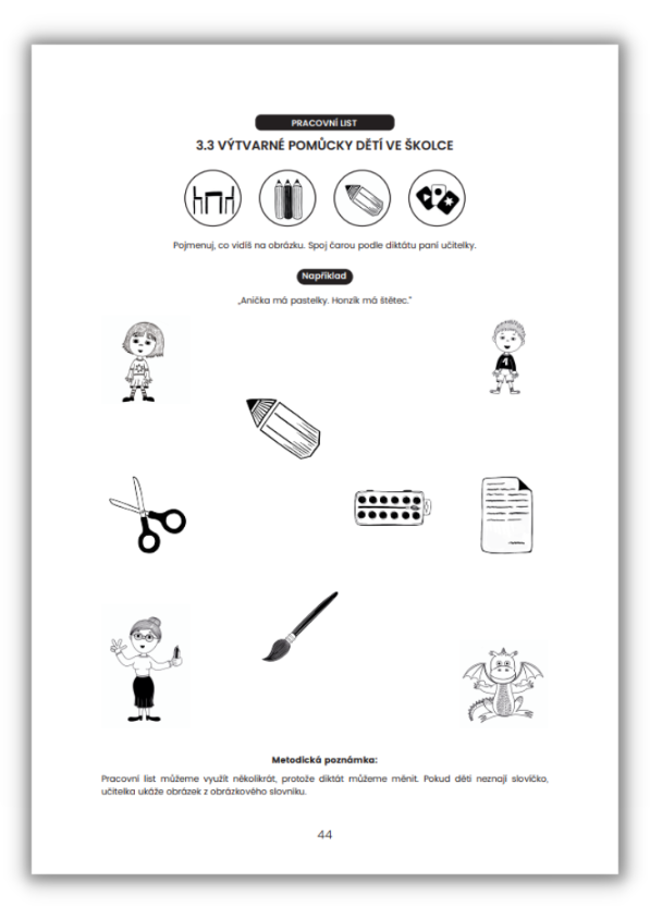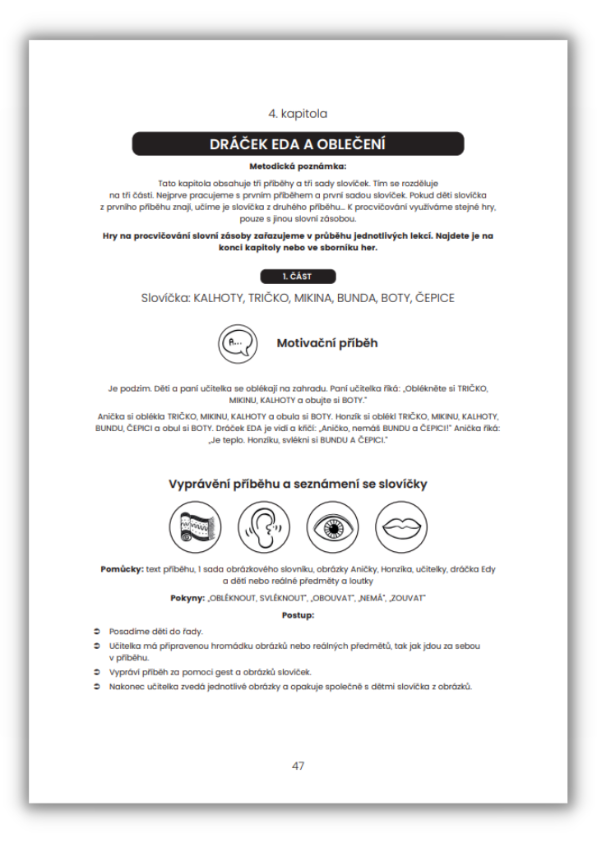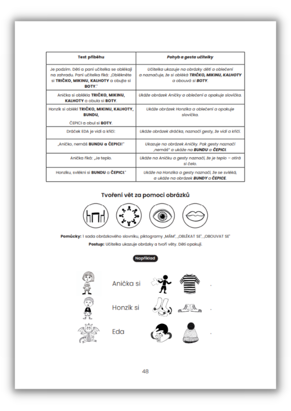 Dále obsahuje metodiku výuky dětí s OMJ, vysvětlivky použitých ikon, piktogramy sloves a sborník her.