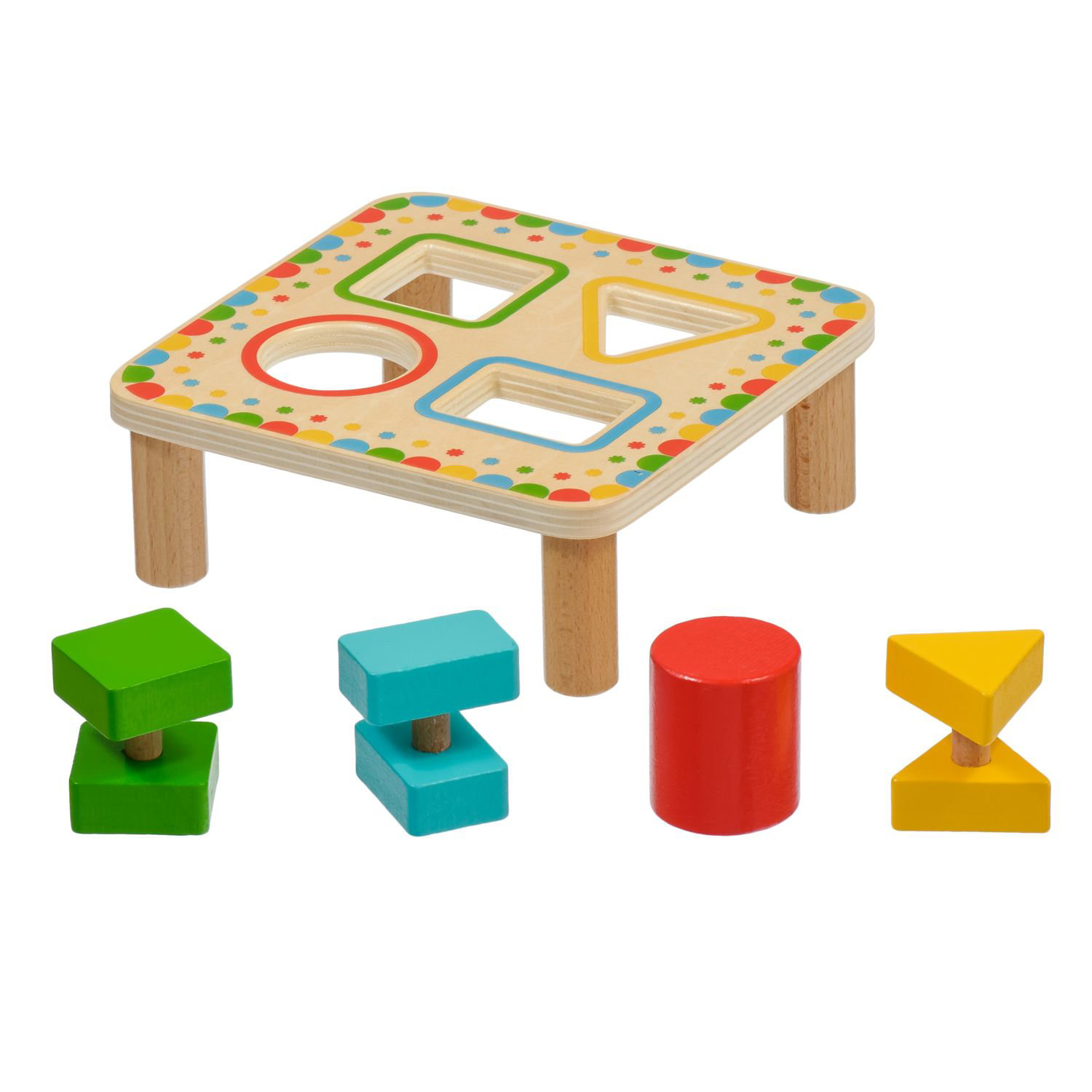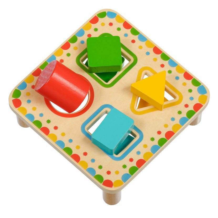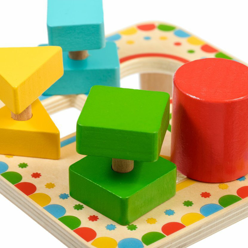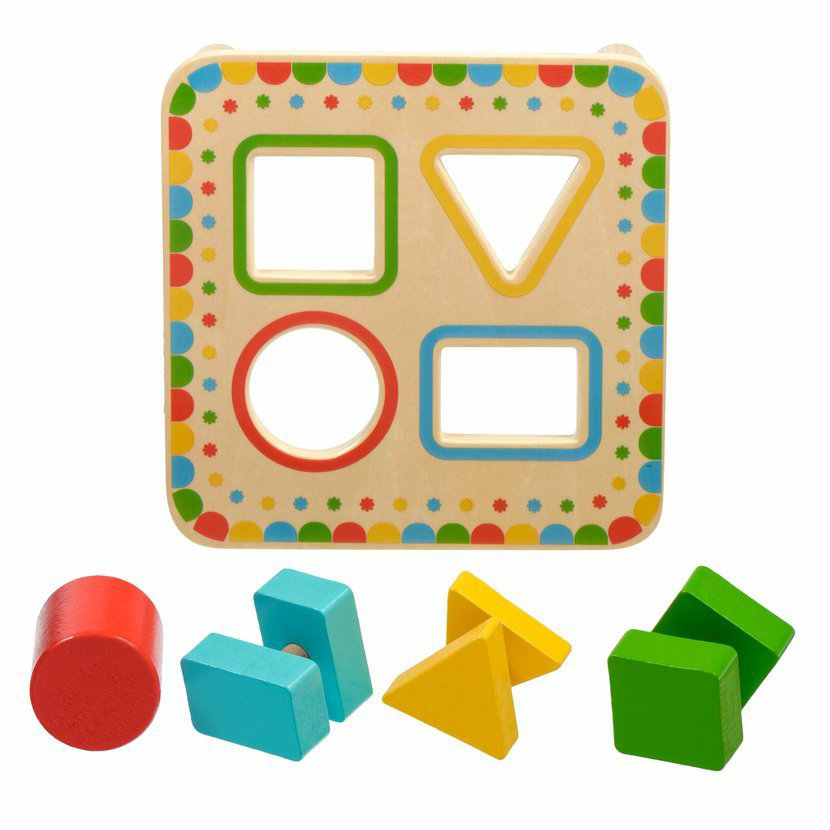 Třídění geometrických tvarů není jen běžná dřevěná vkládačka, která učí děti poznávat základní geometrické tvary a barvy. Hra má totiž tři důmyslné dvoudílné vkládací prvky.