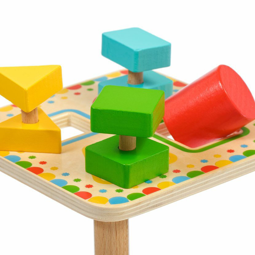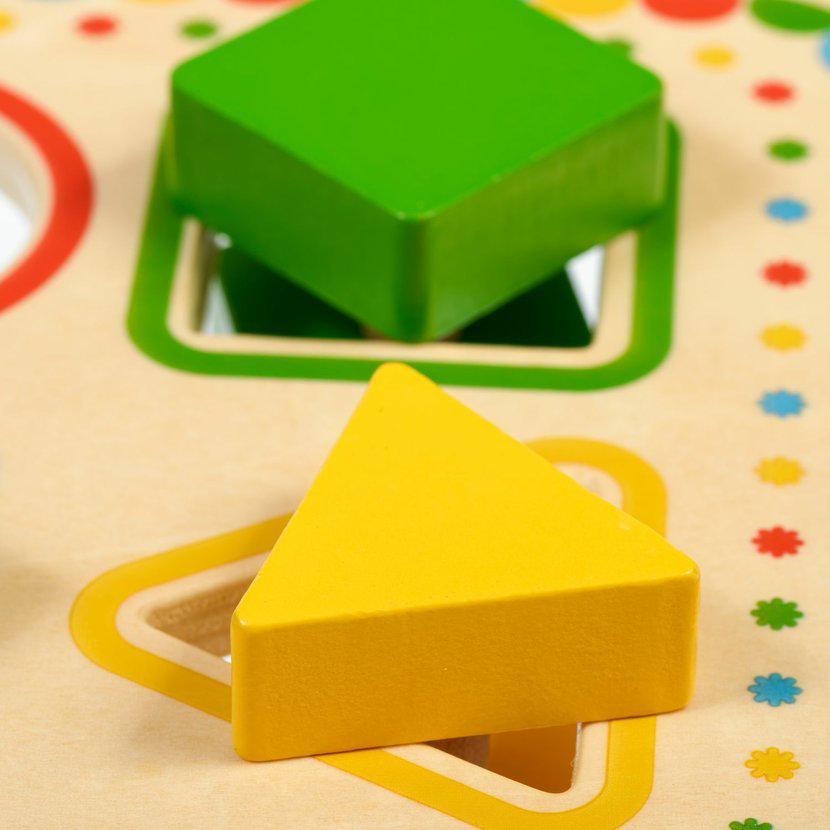 Dítě tedy bude muset nejprve tyto prvky roztřídit a přiřadit k odpovídajícím otvorům a následně najít způsob, jak je skrz vybrané otvory prostrčit. Dvoudílné prvky je totiž třeba při průchodu deskou po prvním vsunutí správně pootočit, aby prošel skrz otvor celý vkládací prvek.