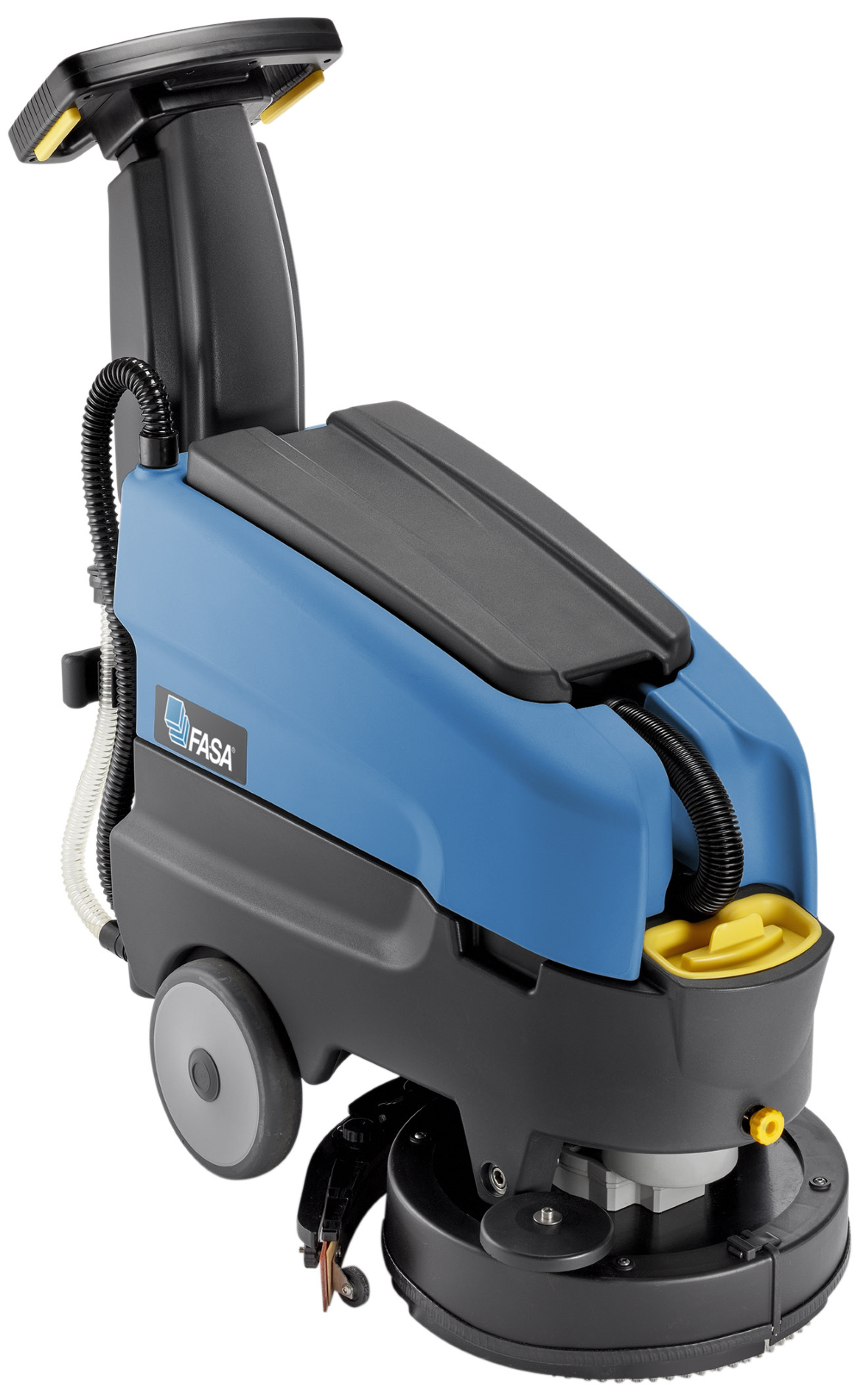 Mycí stroj na podlahu A1.5 36 E Fasa. Kompaktní síťový mycí stroj, napájení 230 V, mycí záběr 360 mm, délka sušící lišty 460 mm, otáčení na malém prostoru, systém rychlé výměny kotouče