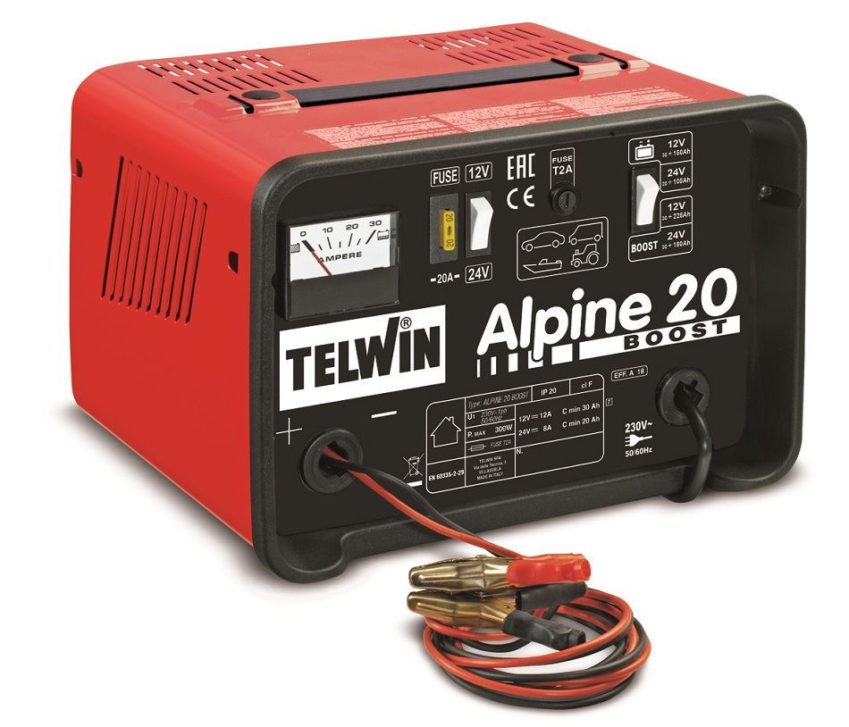 Nabíječka autobaterií Telwin Alpine 20 Boost 12/24 V, 18/12 A, pro automobilové baterie 30-225 Ah s elektrolytem, rychlé-pomalé nabíjení, vhodná i pro auta s dieslovým motorem.