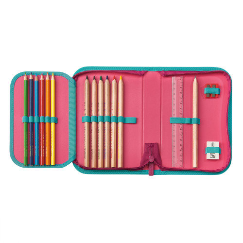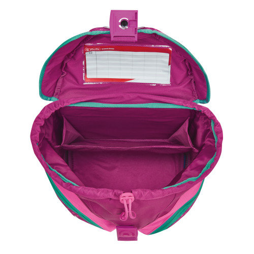 Pětidílný set se skládá z batohu, vybaveného penálu, sáčku na cvičky, desek na sešity A4 a svačinového boxu. Díky jednoduše nastavitelnému zádovému systému batoh snadno nastavíte podle aktuální výšky dítěte. Má měkkou horní klopu a horní část aktovky je zajištěna zdrhovadlem, čímž přitáhnete učivo k zádům. Odnímatelný bederní pás umožňuje optimální rozložení váhy z ramen do horní pánevní oblasti. Integrovaný hrudní popruh poskytuje dodatečnou podporu při nošení – batoh nesklouzává z ramen.