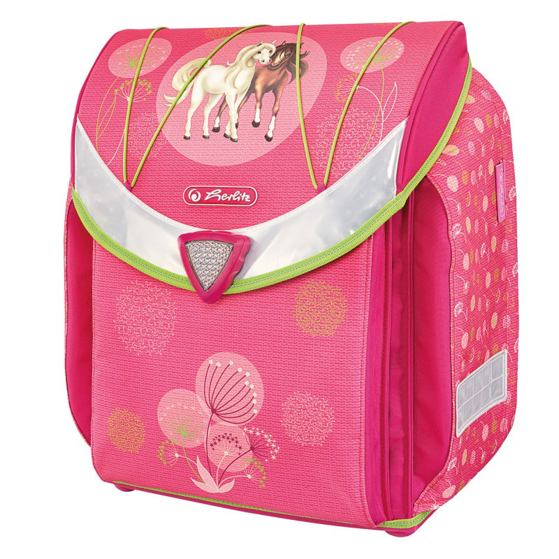 Školní taška Flexi - Koně, 39 x 36 x 22 cm, anatomický tvar, polstrování zad, nastavitelné ramenní popruhy, hrudní popruh, magnetický uzávěr, přední kapsa, boční kapsy, vnitřní přihrádky, reflexní pruhy, hmotnost 1200 g, objem 18 l, výbava: penál 17 dílů, pouzdro, sportovní taška, svačinový box