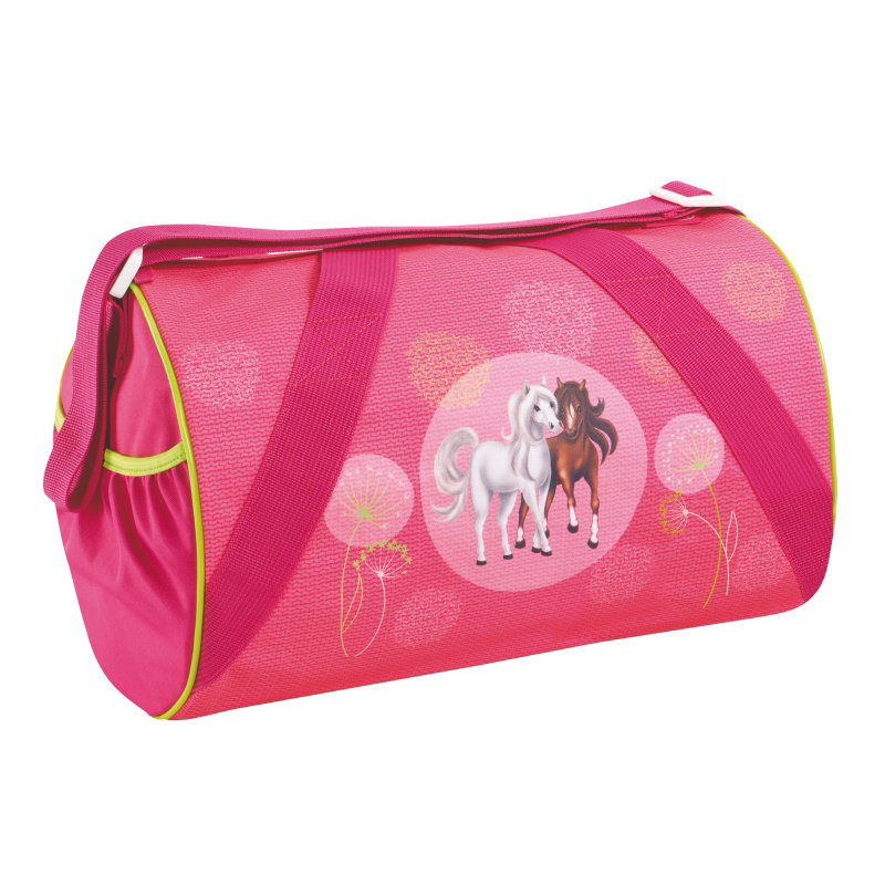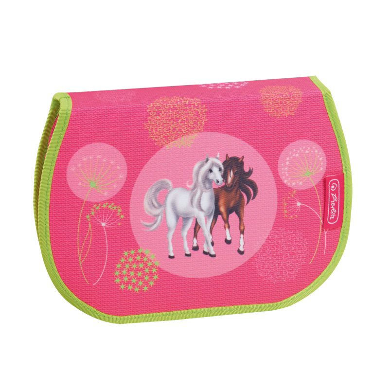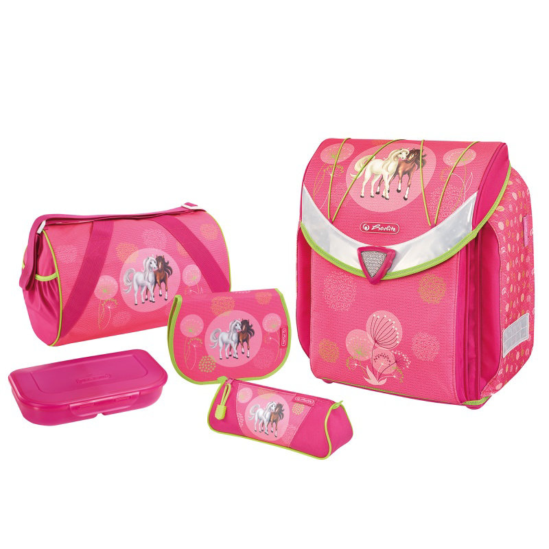 Růžový set s motivem koní obsahuje školní batoh, vybavený penál, pouzdro, sportovní tašku a svačinový box. Penál je vybaven psacími potřebami (celkem 17 ks).